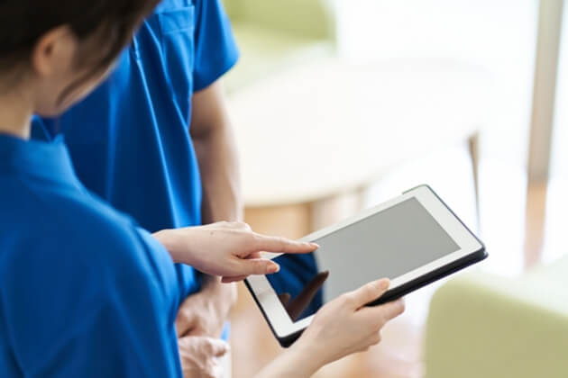 介護業務改革 スマホによる記録管理や、AIカメラやナースコール等の導入による業務効率化を推進致します。介護看護情報をIT化により医療機関やケアマネジャーと共有し、医師との連携強化を図ることで、リアルタイムにご利用者さま情報を把握し、適切なサービスを行えるようにします。従来の紙面や口頭での申し送りを止め、クラウドによる情報共用を促進し、ご利用者さま対応の時間を増やし、事務作業の時間を極小化します。